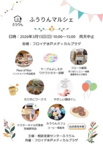 2026年3月11日 / 最終更新日 : 2026年3月11日 foryou お知らせ ふうりんマルシェ♪ 弊社提携企業ふうりん様が、初のマルシェを開催します♪ はなぶさ様も出店されます。 可愛い絵がプリントされたトートバッグや、リース、小物入れなど たくさんのハンドメイド作品が販売されます。 お時間ある方は、是非いらしてください♪